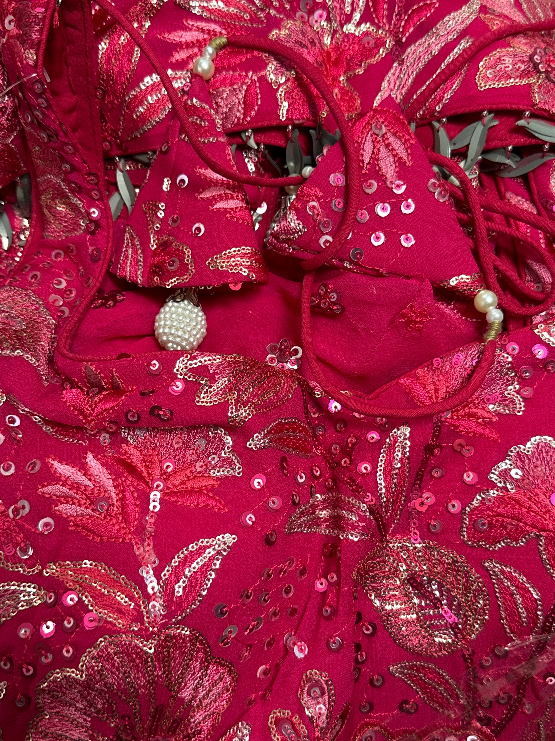 Now available in 4 elegant shades, this ombré Anarkali features delicate thread and sequin embroidery, paired with flowy palazzos and a sheer embellished dupatta. Perfect for daytime weddings and festive events.