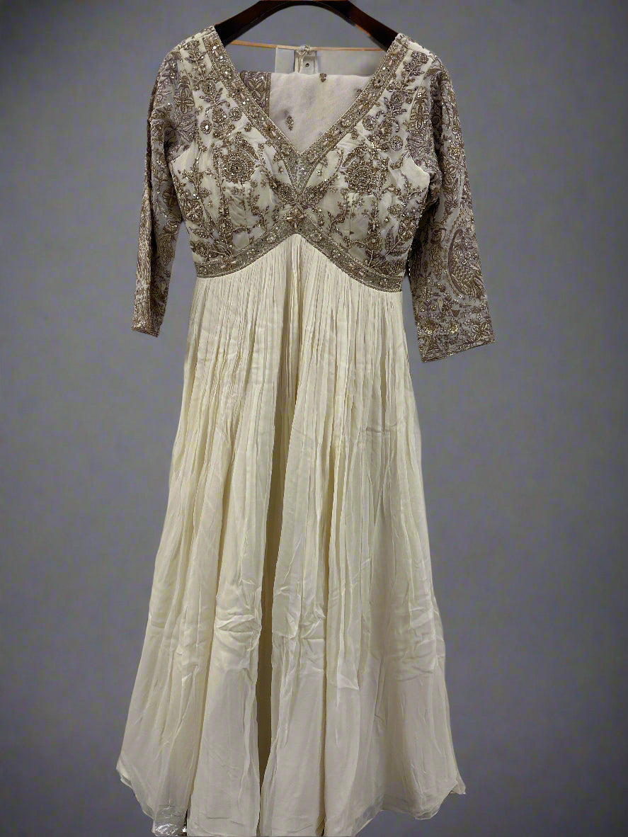 A bright Anarkali featuring a fitted bodice and 3/4 sleeves richly embellished with intricate silver zari floral embroidery, flowing into a pleated, floor-length skirt and paired with a matching dupatta edged in detailed zari borders.
