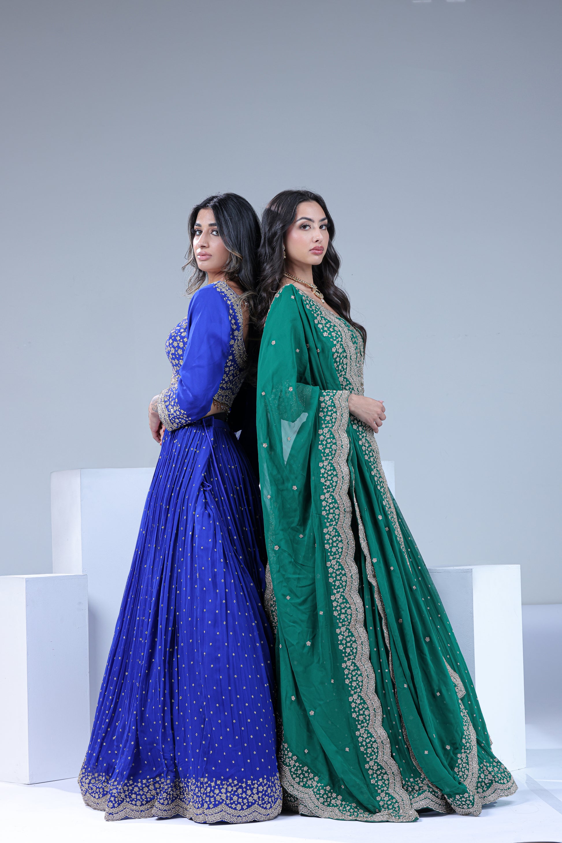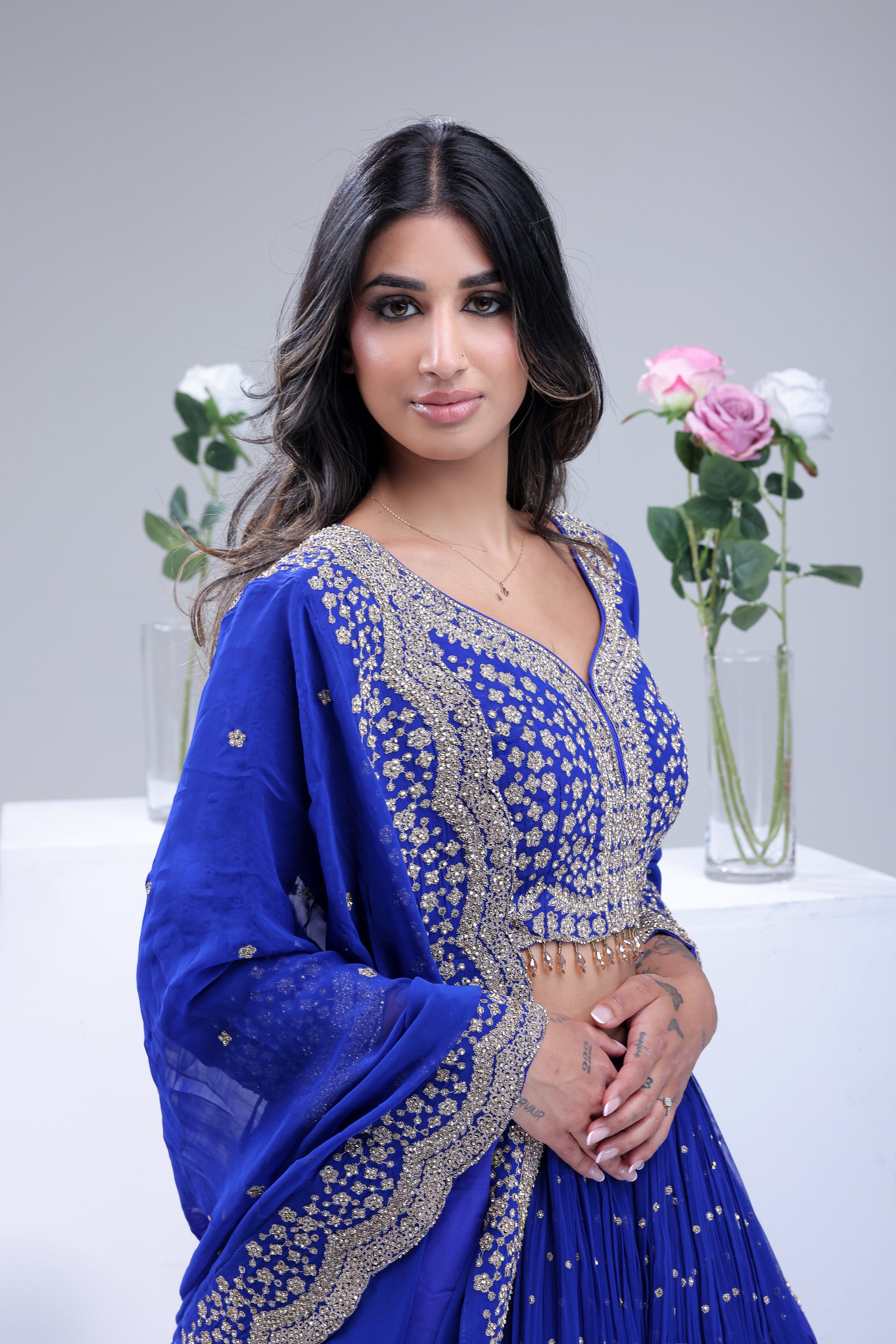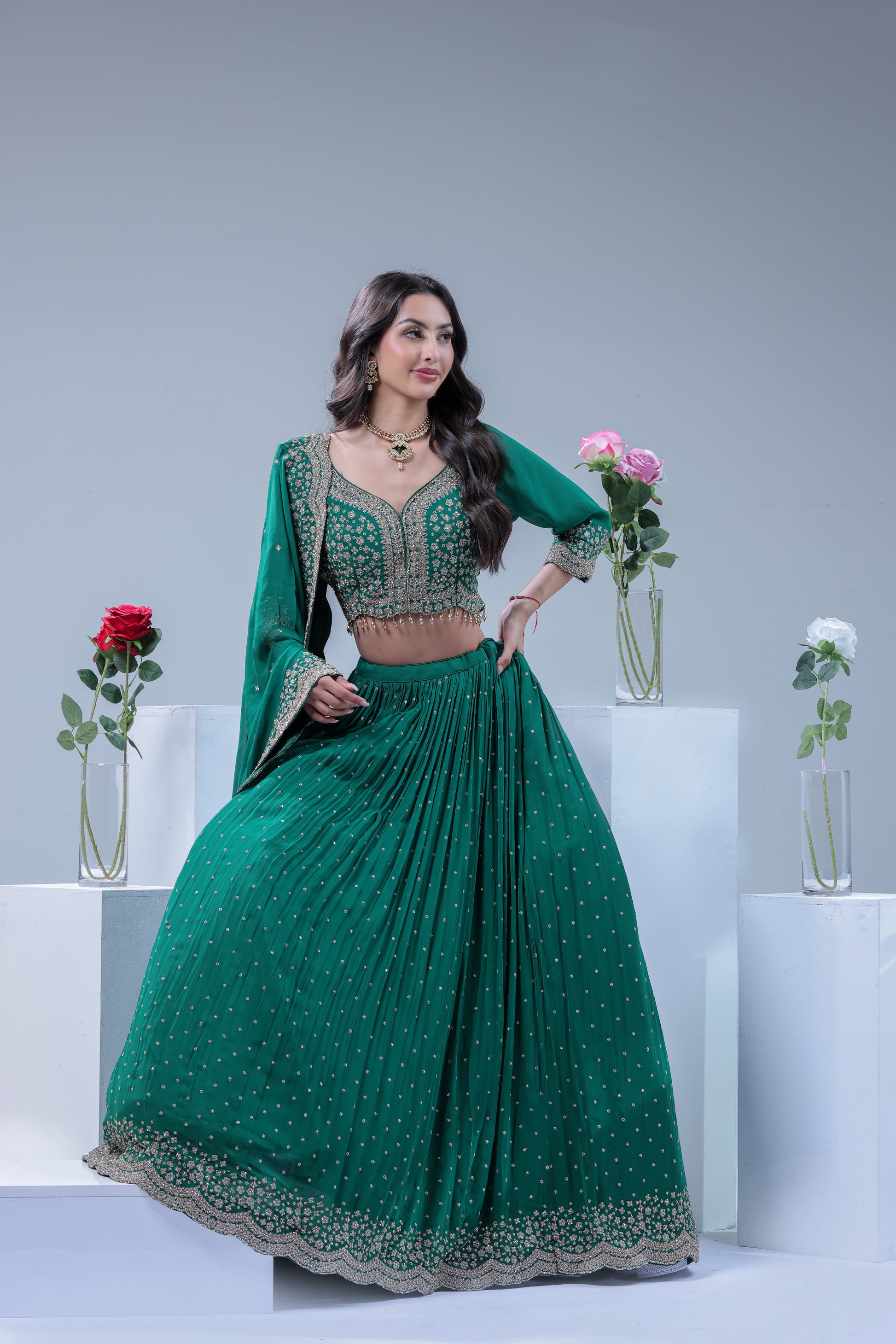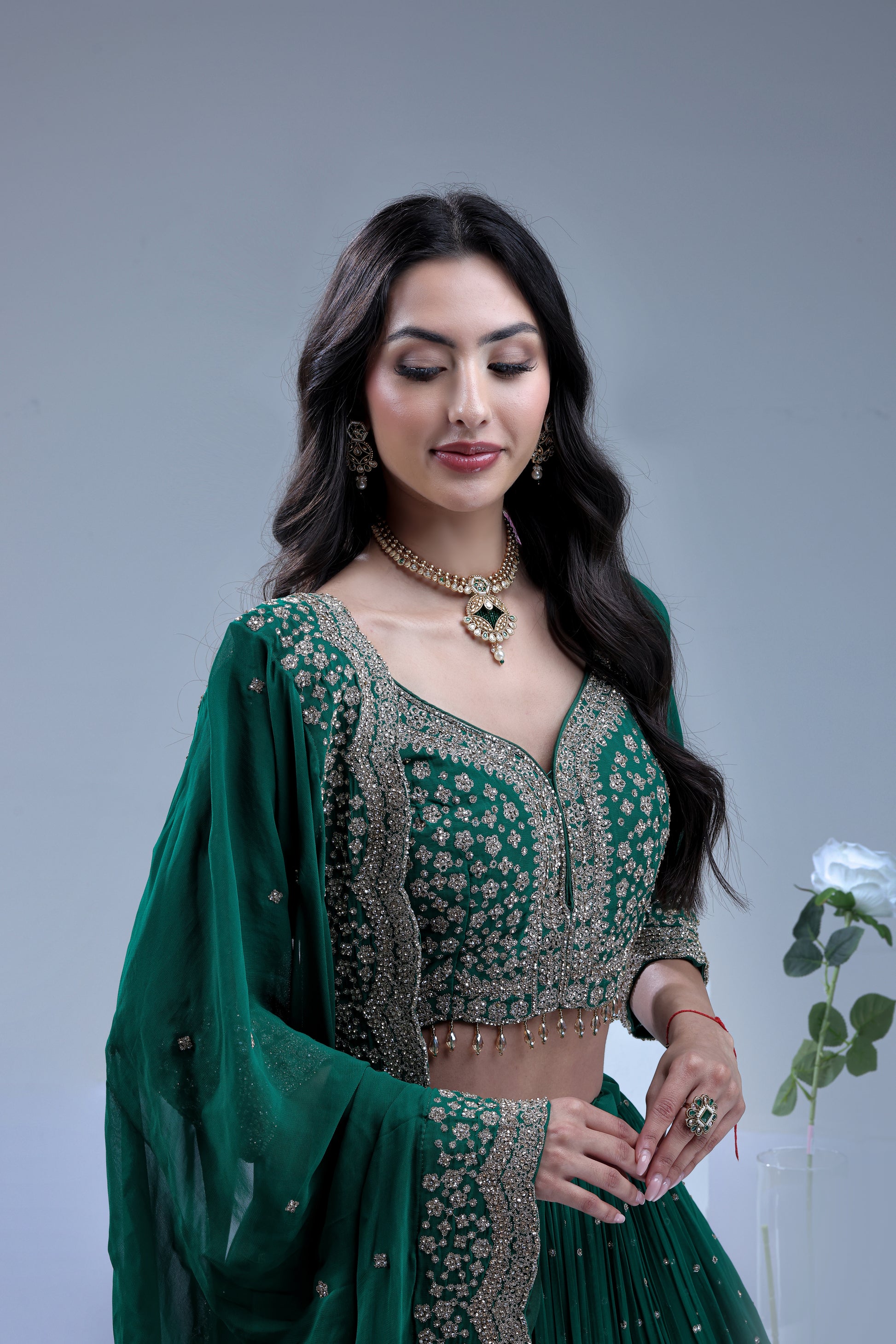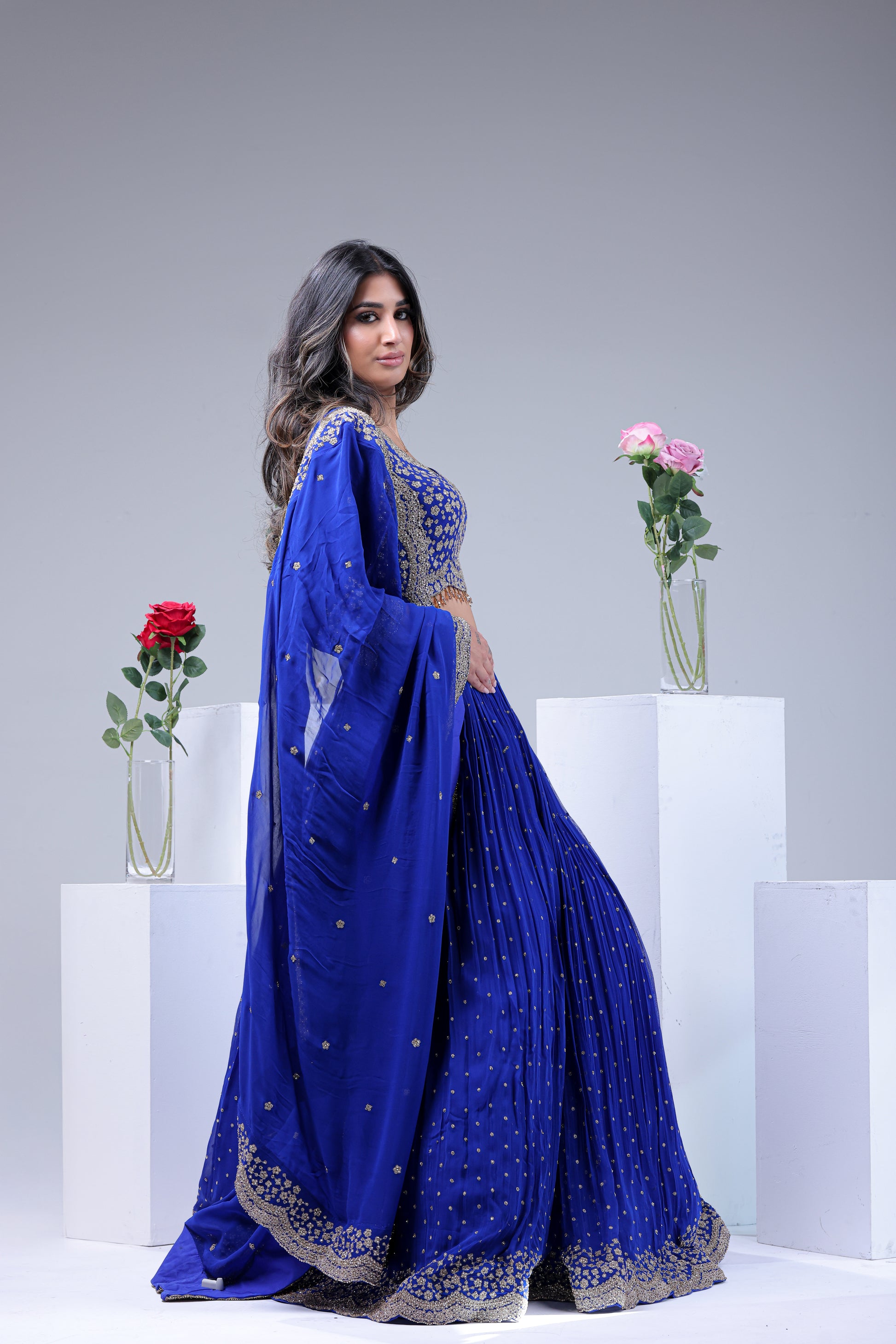 A regal ensemble featuring a heavily stone-embellished cropped blouse paired with a flowing, pleated skirt and a matching dupatta.