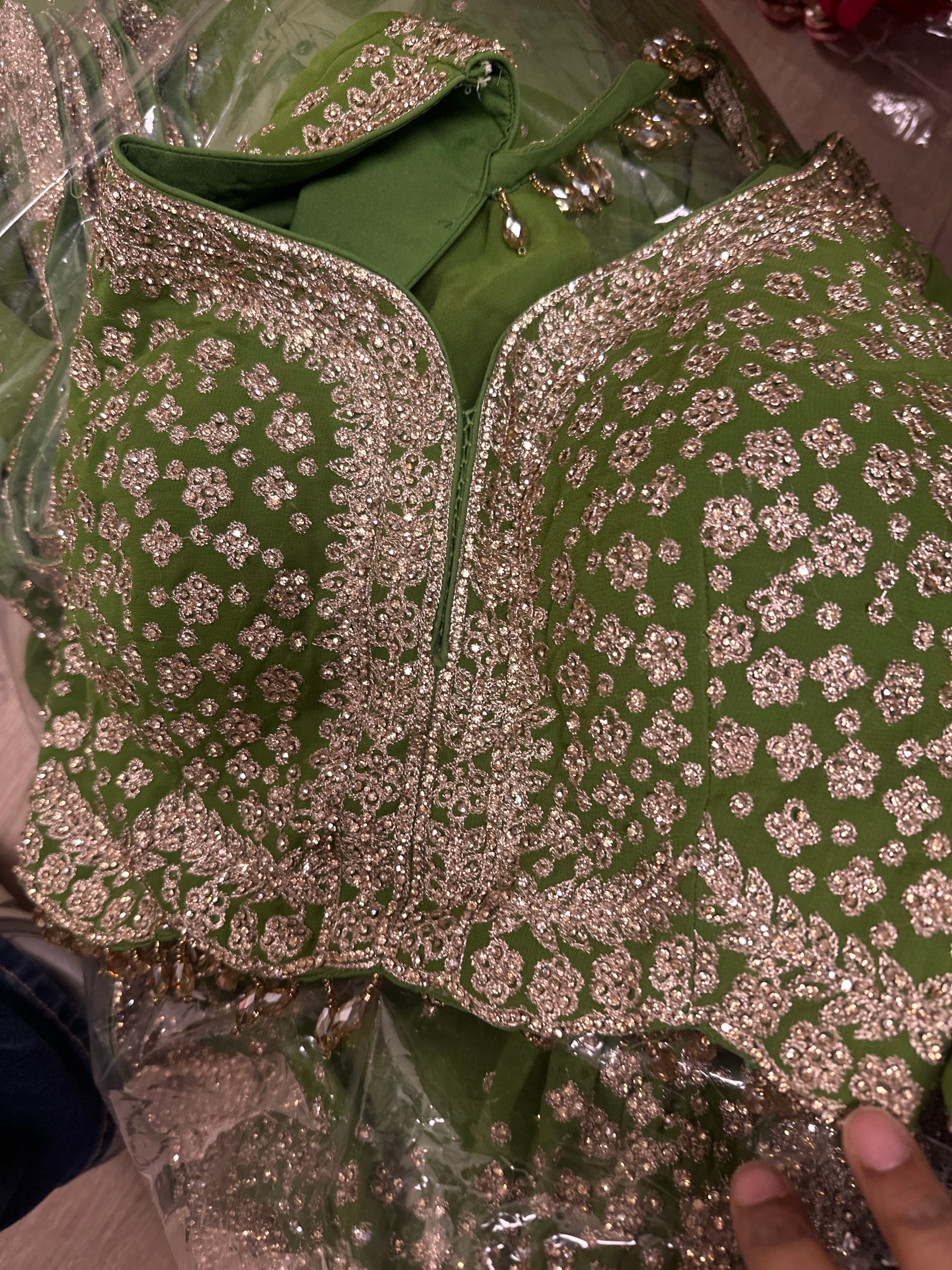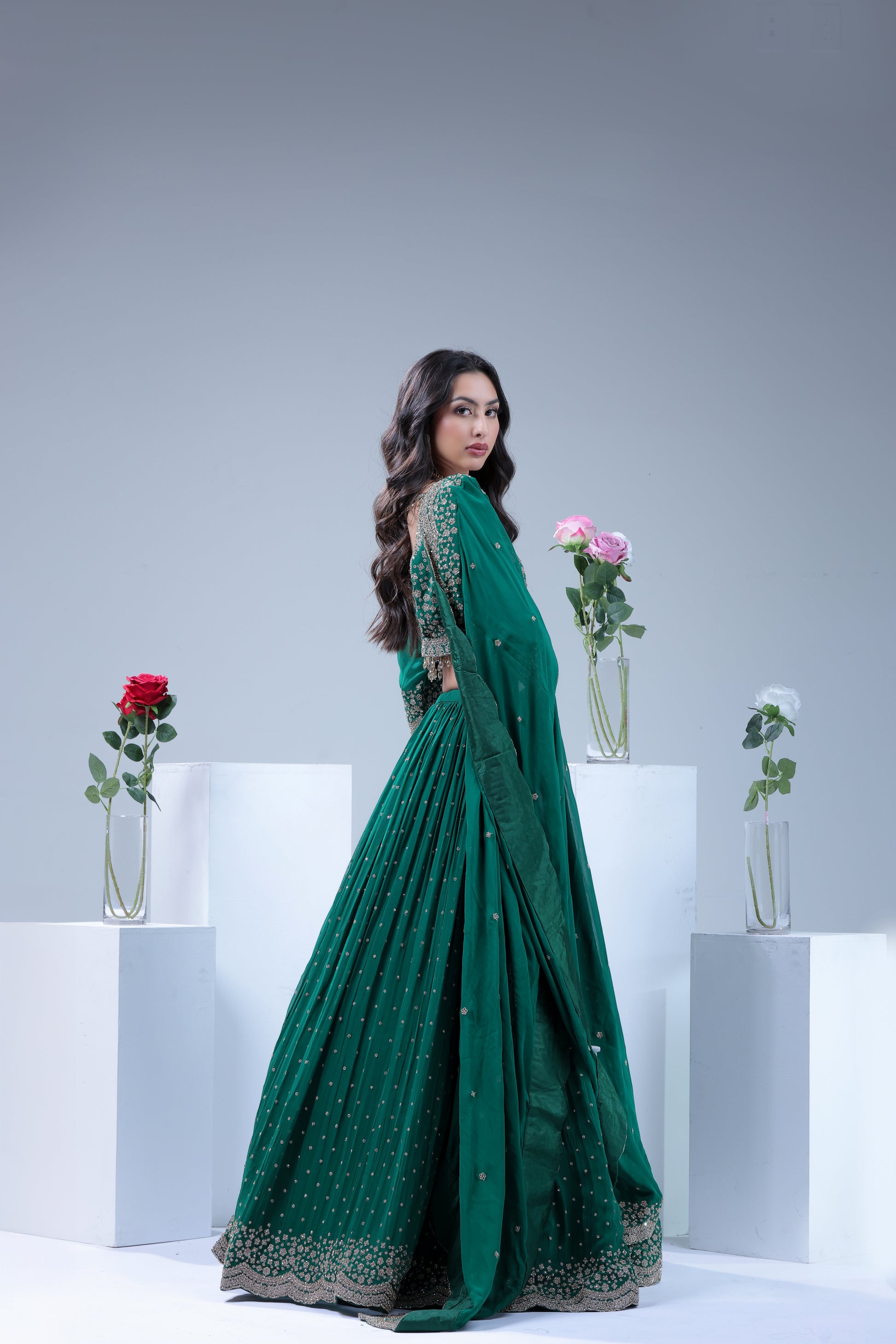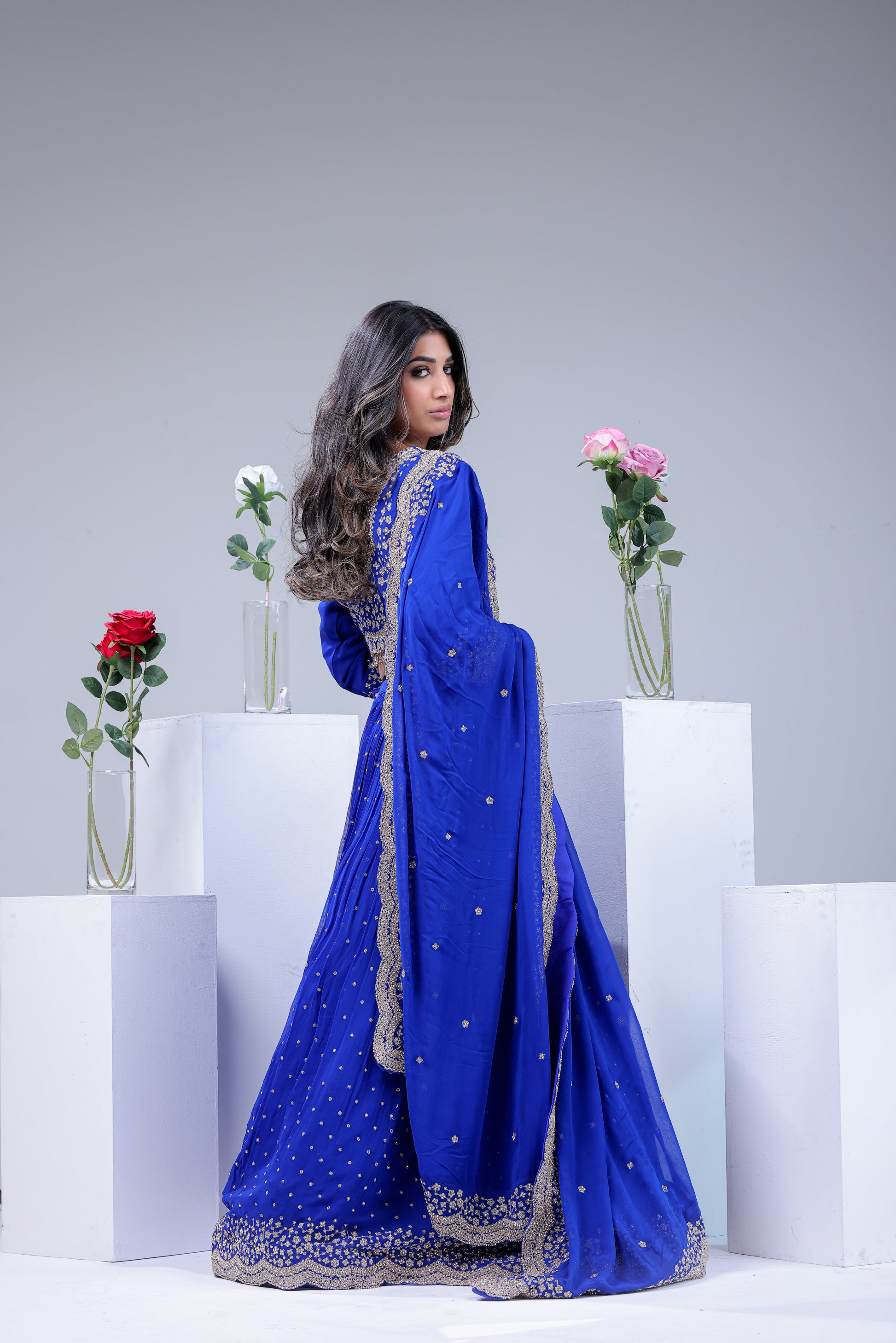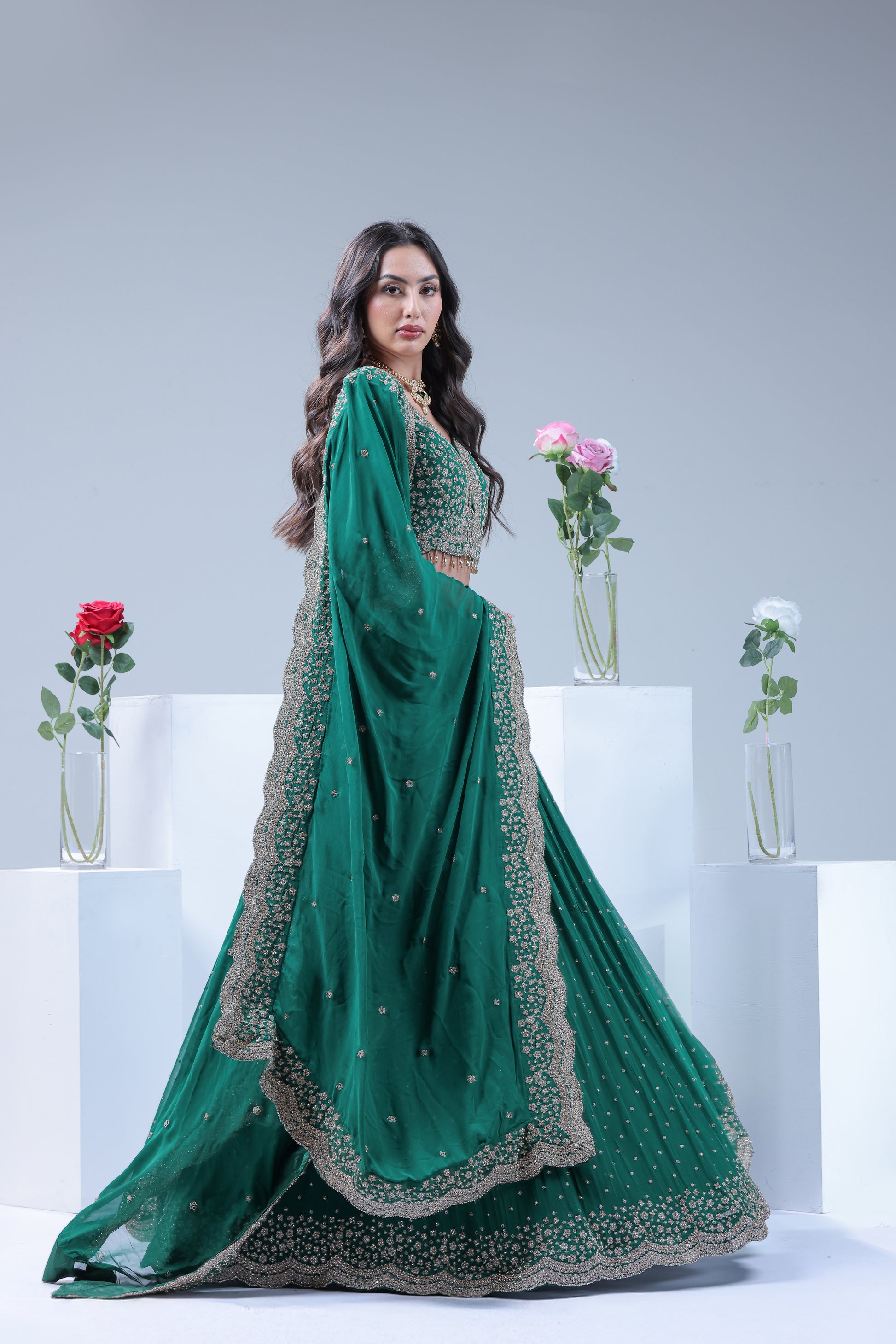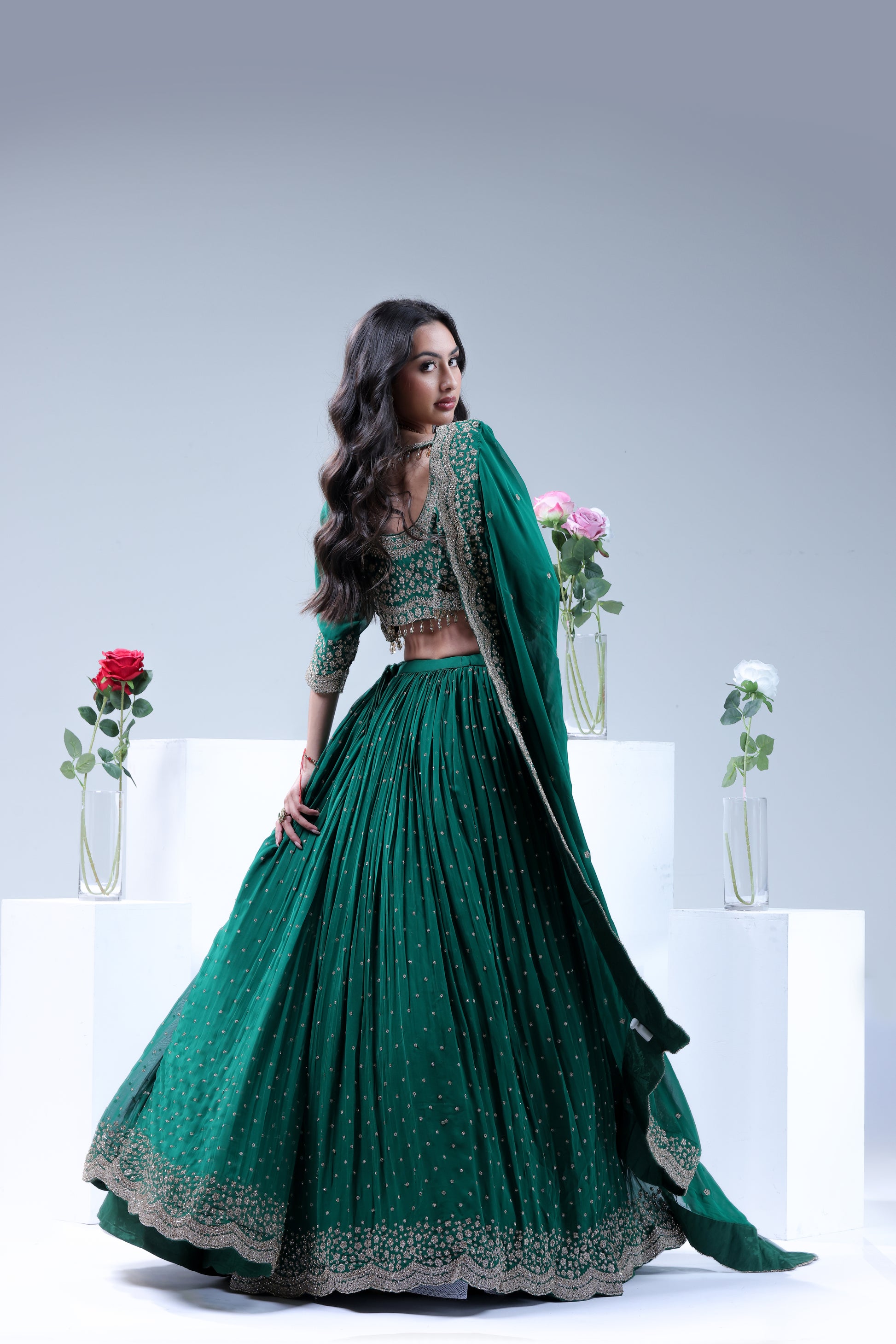 A regal ensemble featuring a heavily stone-embellished cropped blouse paired with a flowing, pleated skirt and a matching dupatta.